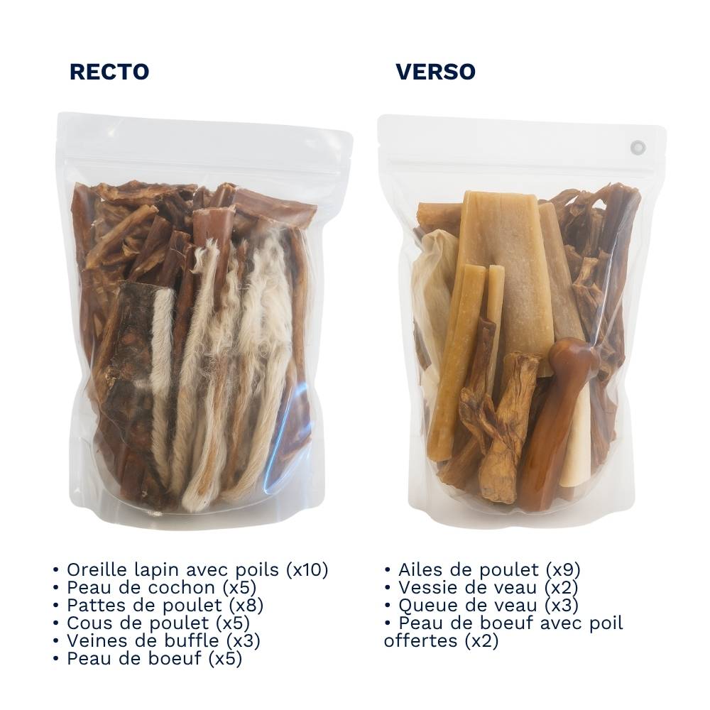 Ce pack s’adresse à tous les chiens, du plus petit au plus costaud. Que votre compagnon soit un croqueur intense ou un gourmet curieux, il y trouvera de quoi satisfaire ses envies de mâcher.